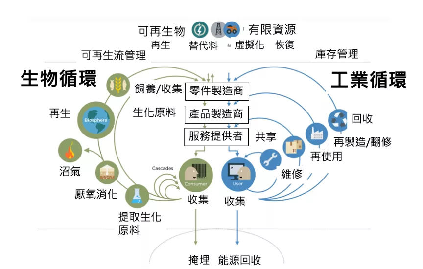 由Ellen McArthur 基金會的循環經濟圖(見圖)可知循環經濟分為工業循環與生物循環,生物循環會透過生物再生與消化等模式來做循環,而工業循環有共享、維修、再使用、再製造/翻修,以及回收等各個模式。目的是通過最大限度地延長資源的使用壽命,減少浪費和環境污染,同時提高經濟價值。