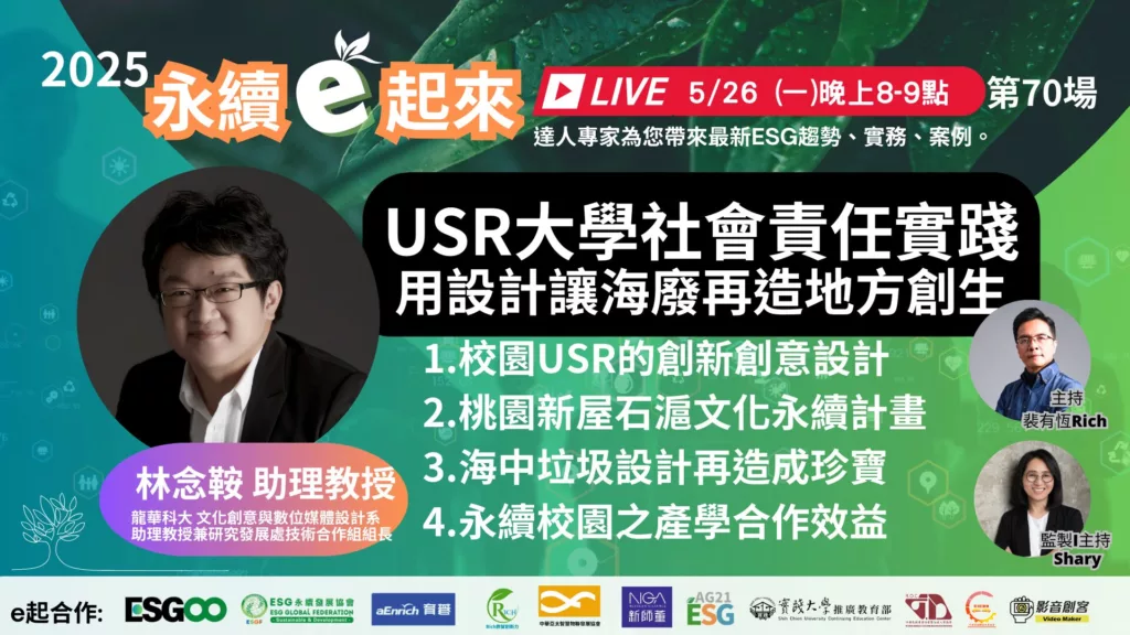 🌏『永續e起來』介紹: 固定週一晚上8-9點,達人專家為您帶來最新ESG趨勢與企業組織永續發展實務與案例。