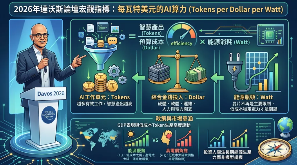 2026 年達沃斯世界經濟論壇上,微軟執行長 Satya Nadella 提出 Tokens per Dollar per Watt 作為衡量人工智慧經濟效率與國家競爭力的新宏觀指標,我們翻譯為每瓦特美元的AI算力。這項概念的關鍵,在於將過去抽象的算力競賽,轉化為可以被衡量、比較與治理的能源與成本效率問題,也象徵人工智慧正式進入資源約束的現實階段。